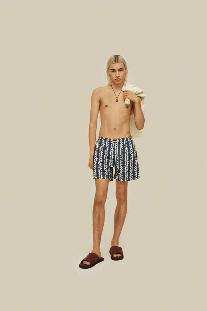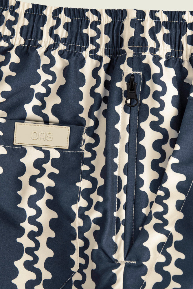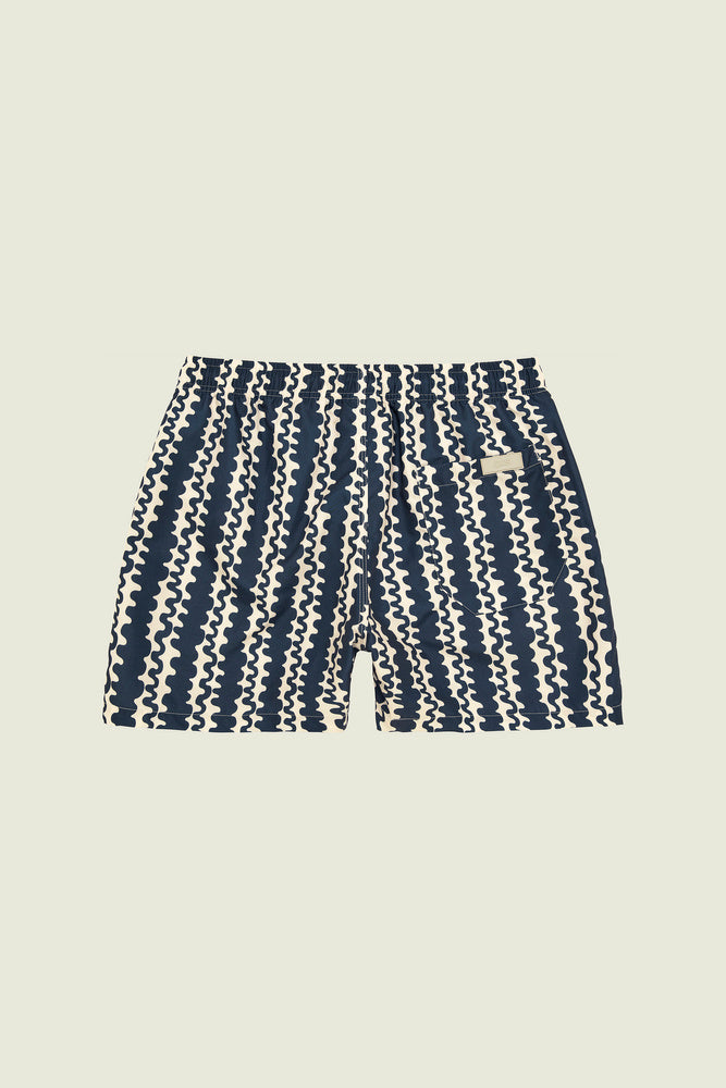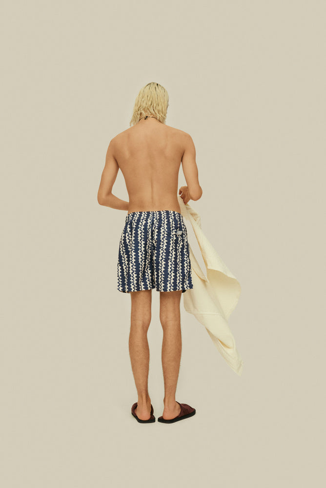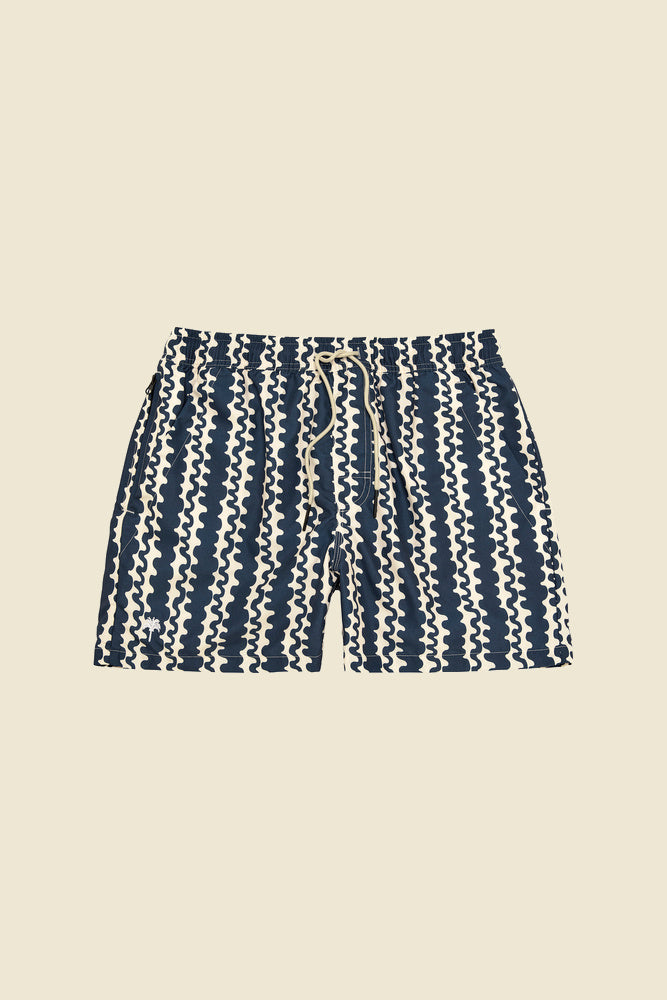 The Blue Scribble swim shorts are tailored from a brushed, quick-drying shell fabric decorated with rhythmic waves reminiscent of sandy shores. Cut for a relaxed, straight fit with an elasticized drawstring waistband and built-in mesh briefs for comfort and support. Keep your keys and cards securely stored in the hidden zip pocket.