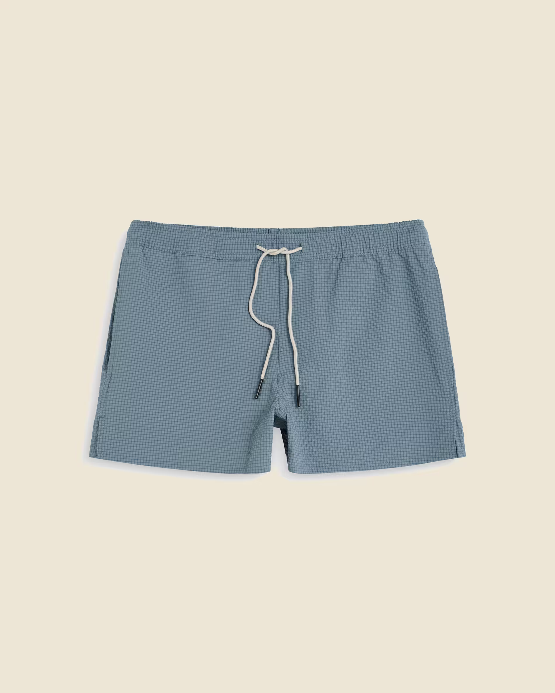 Grey-blue swim shorts in textured seersucker fabric. Elastic waist with side pockets and a hidden zip pocket. Mesh lining for comfort. Short leg length and mid-rise.
