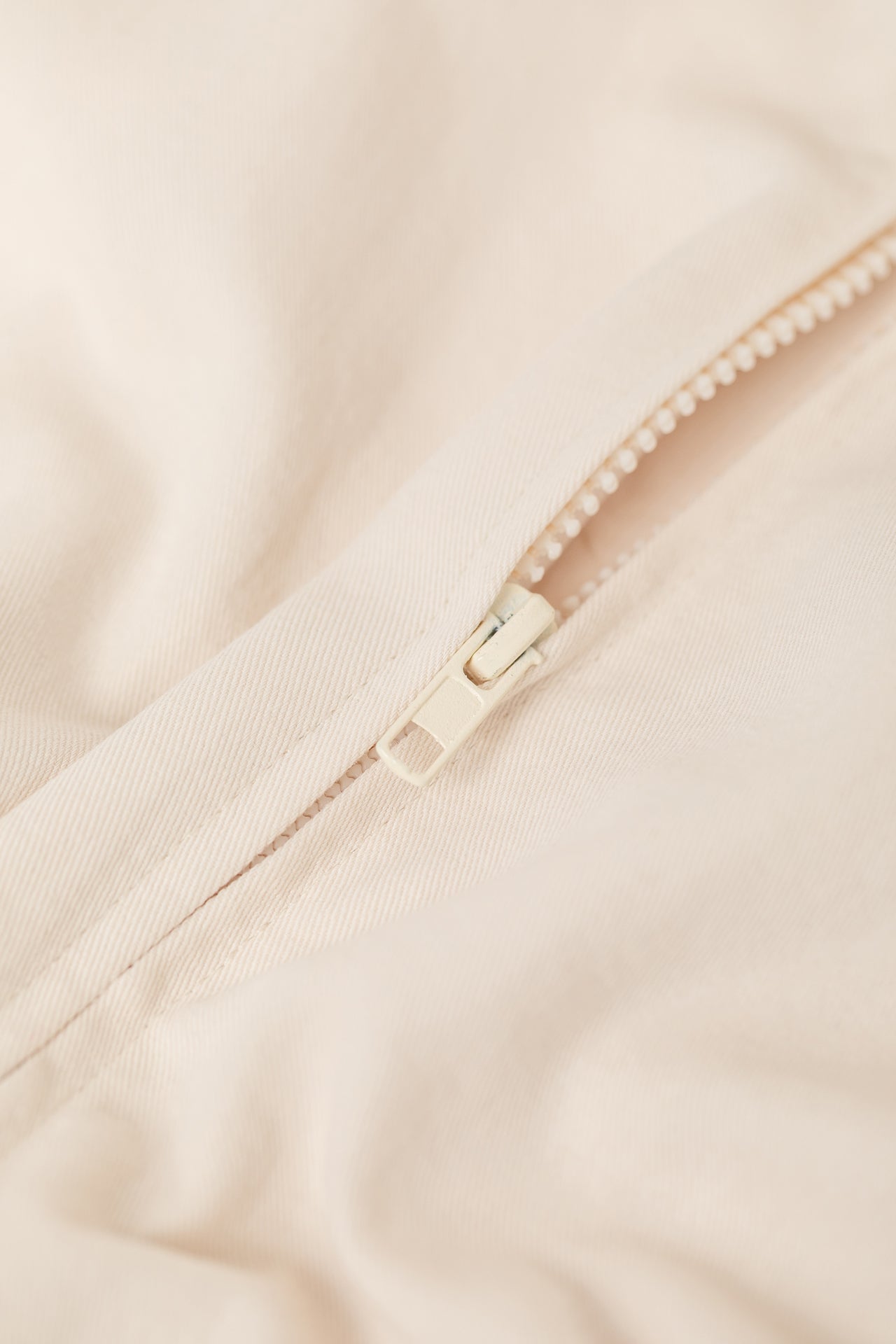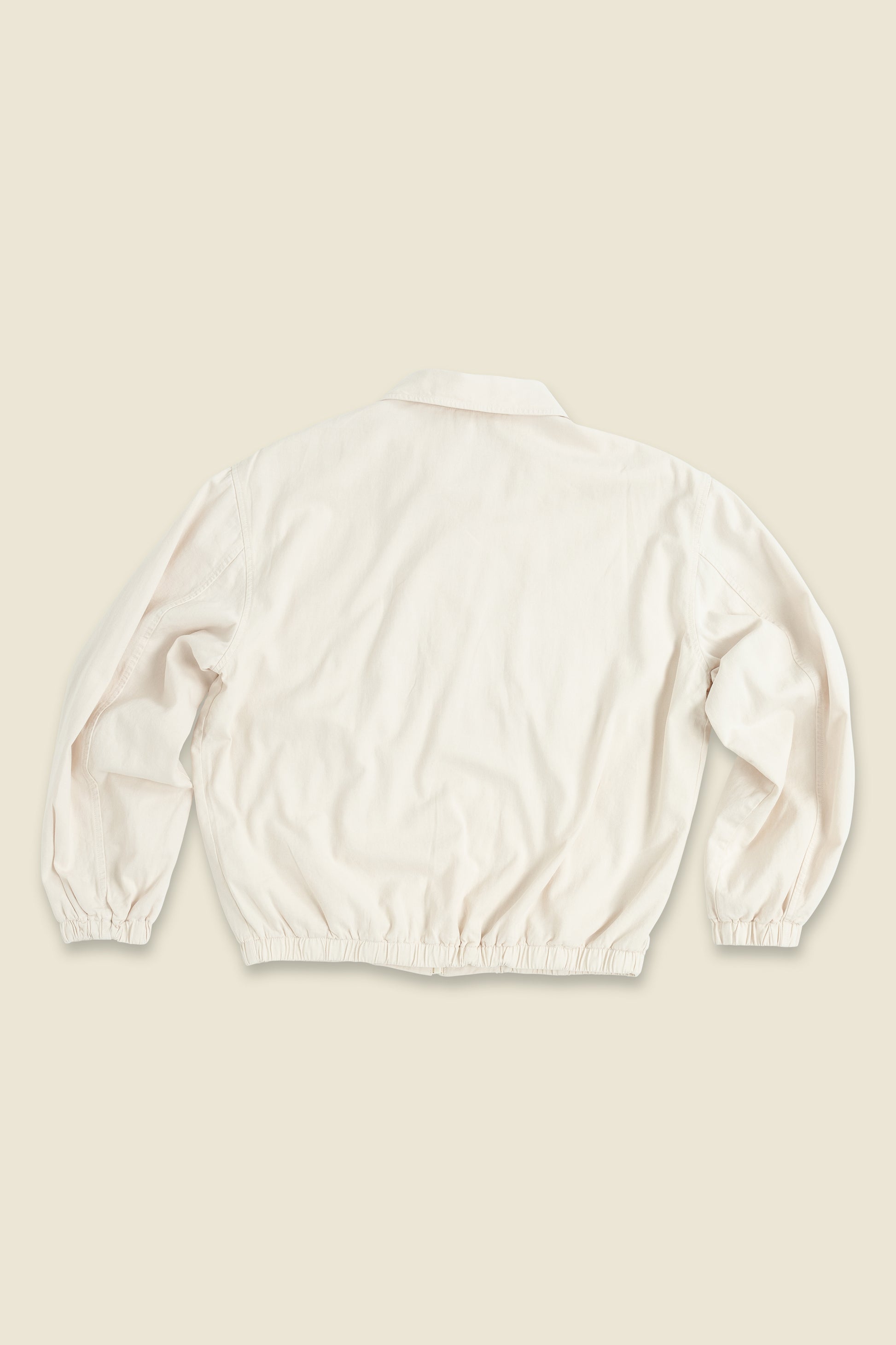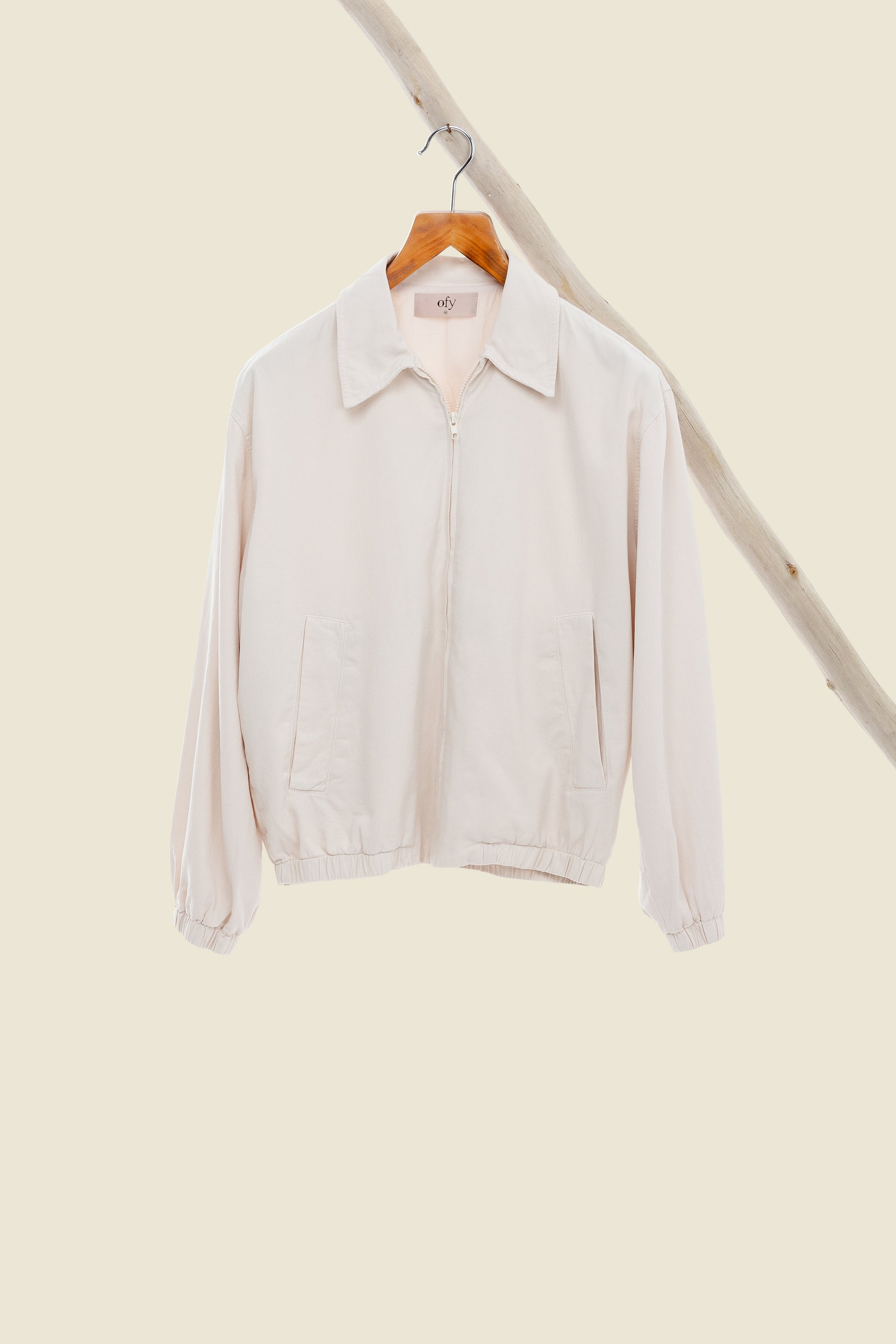 A relaxed, modern silhouette with a wide, easy fit and a semi-cropped length. Designed with a tonal zip front, subtle collar, ultra-soft cotton lining, and minimalist pocketing, the jacket is finished with elastic at the cuffs and hem for a soft blouson shape that sits effortlessly on the body.