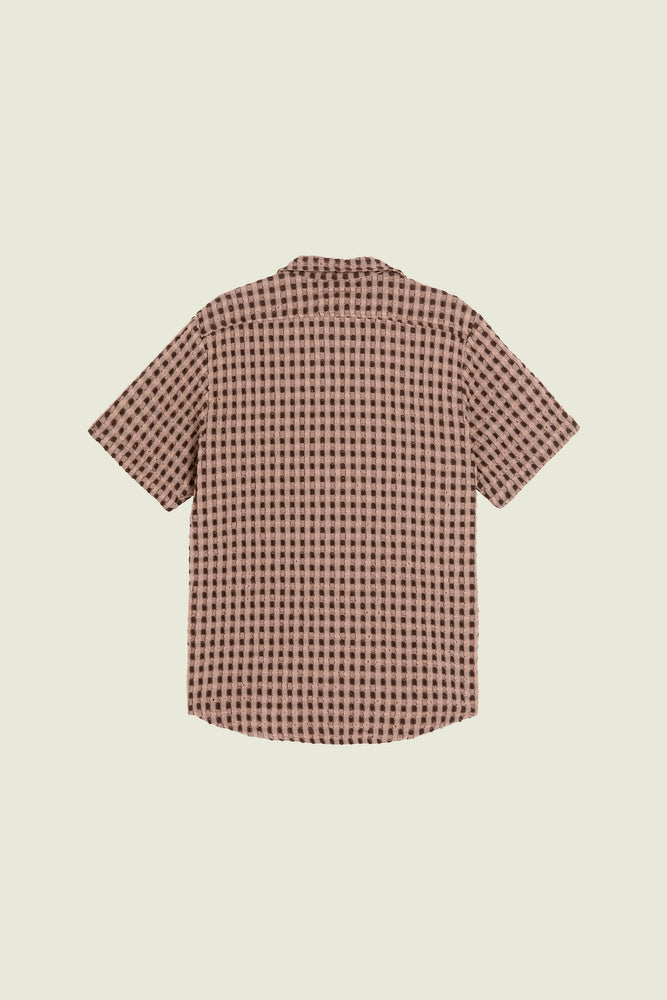 The Black Cuba waffle shirt is woven with generous amounts of cotton to a waffle texture that feels particularly soft and breezy against skin. The relaxed silhouette features boxy sleeves, a resort collar and buttons running down the front.