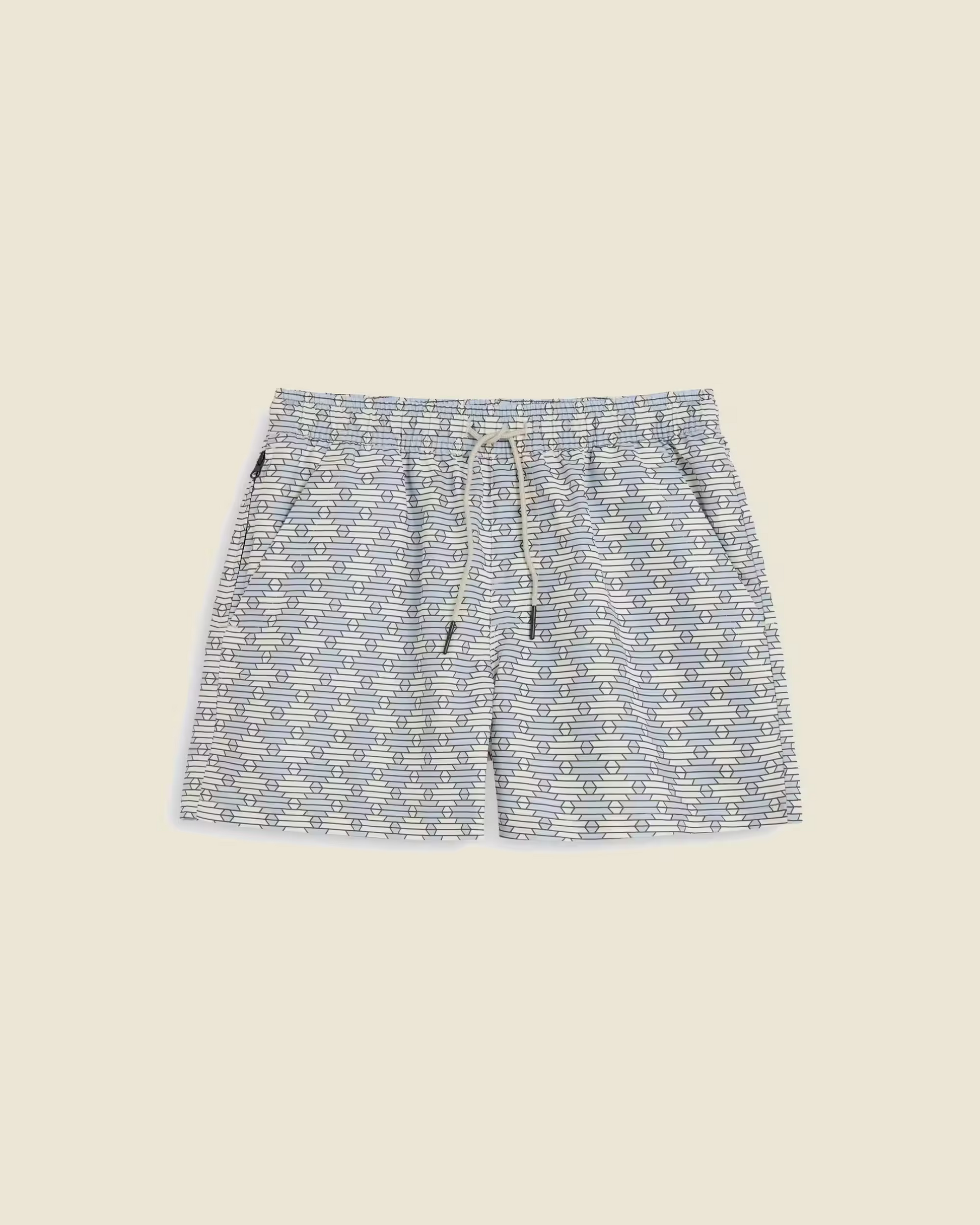 Swim shorts with a blue and beige geometric pattern in lightweight quick-drying fabric. Elastic waist with four pockets including a hidden zip pocket. Mesh lining for comfort.