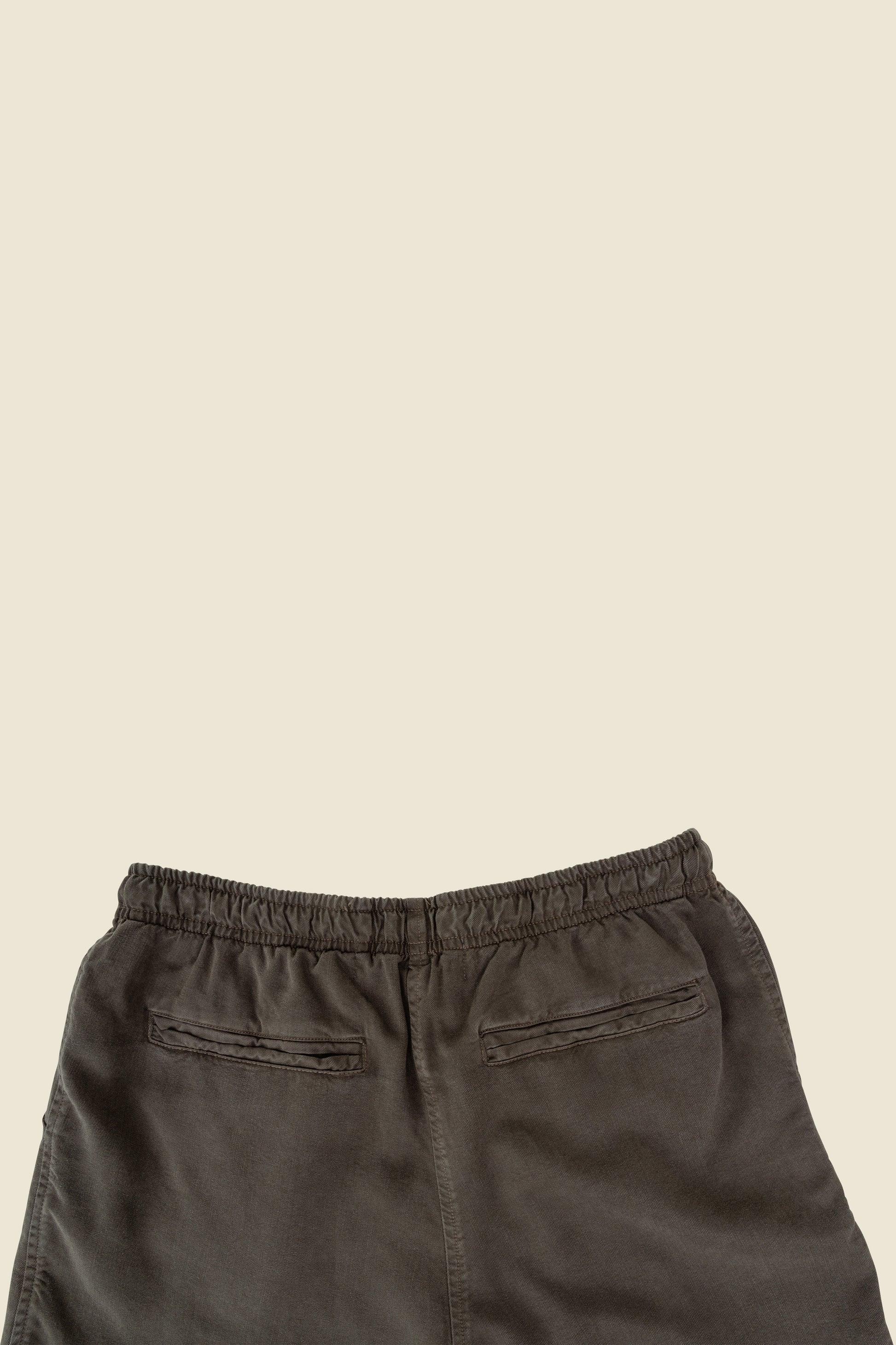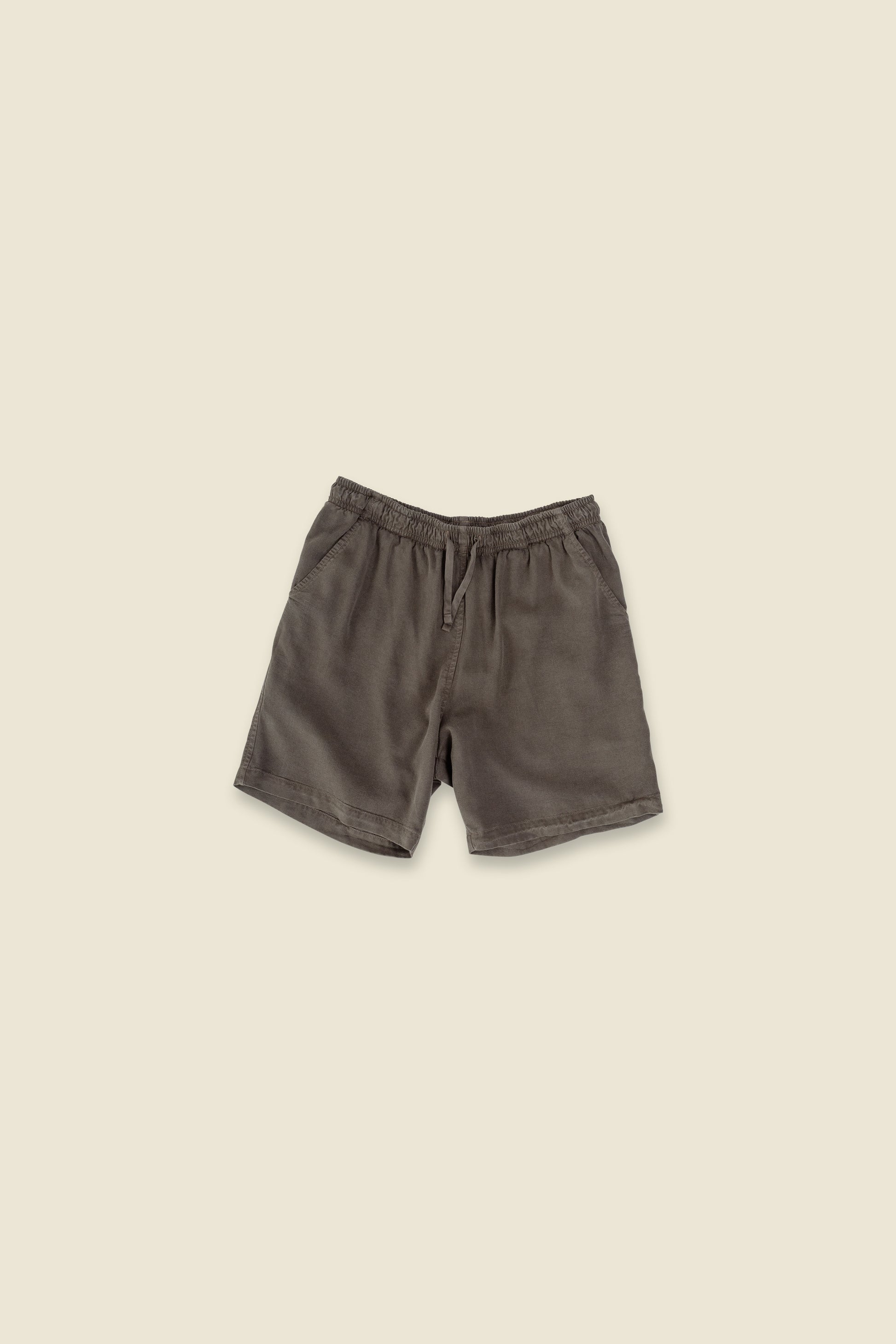 A classic short with an elastic waistband, self-fabric tonal drawcord, clean French seams, and spacious cotton-lined pockets. Finished with two back welt pockets and a 6" inseam.