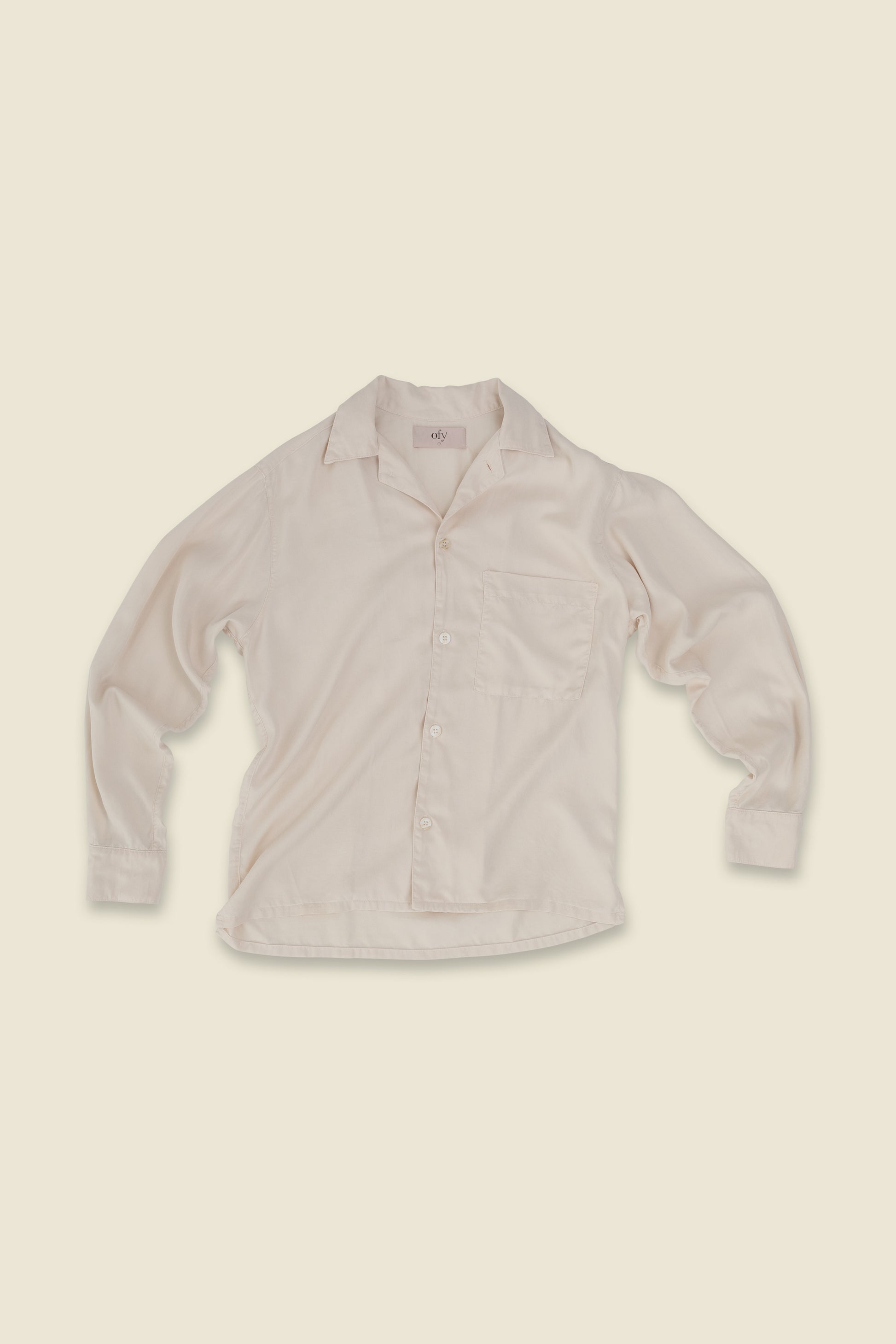 A classic camp-collar shirt with a vintage-inspired design, featuring a relaxed fit, chest pocket, French seams, side slits, and custom buttons.