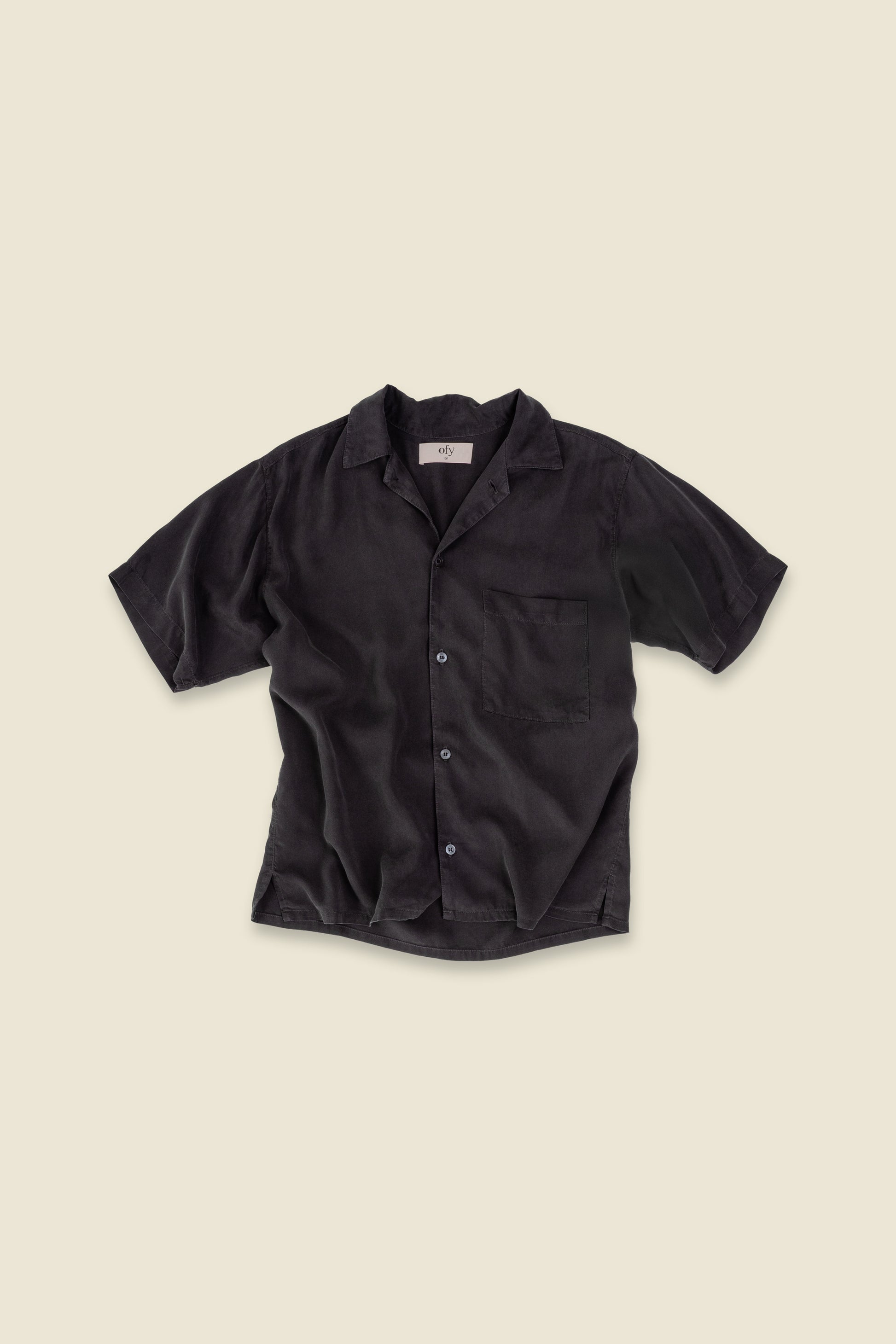 A classic camp-collar shirt with a vintage-inspired design, featuring a relaxed fit, chest pocket, French seams, side slits, and custom buttons.