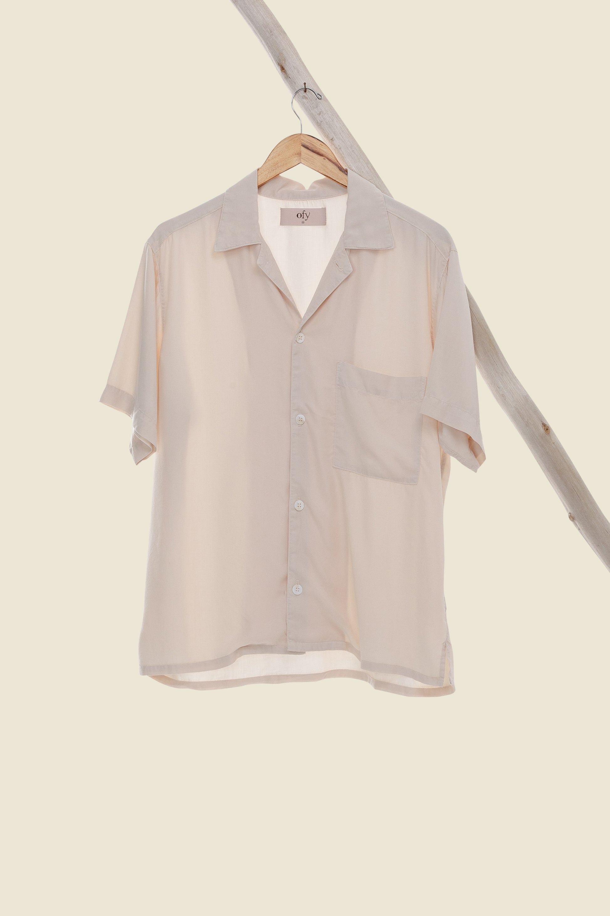 A relaxed camp-collar shirt with a vintage sensibility, featuring a chest pocket, French seams, side slits, and custom buttons.