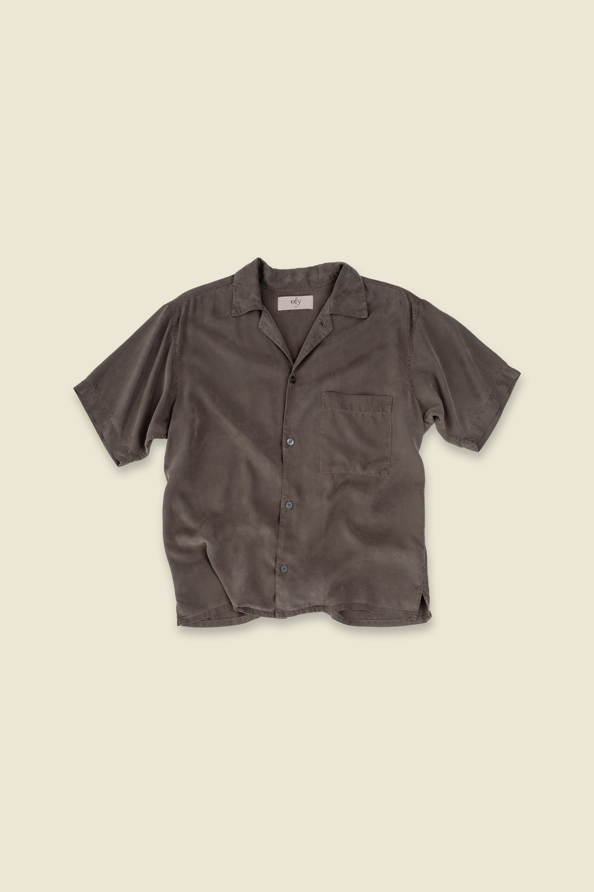 A relaxed camp-collar shirt with a vintage sensibility, featuring a chest pocket, French seams, side slits, and custom buttons.