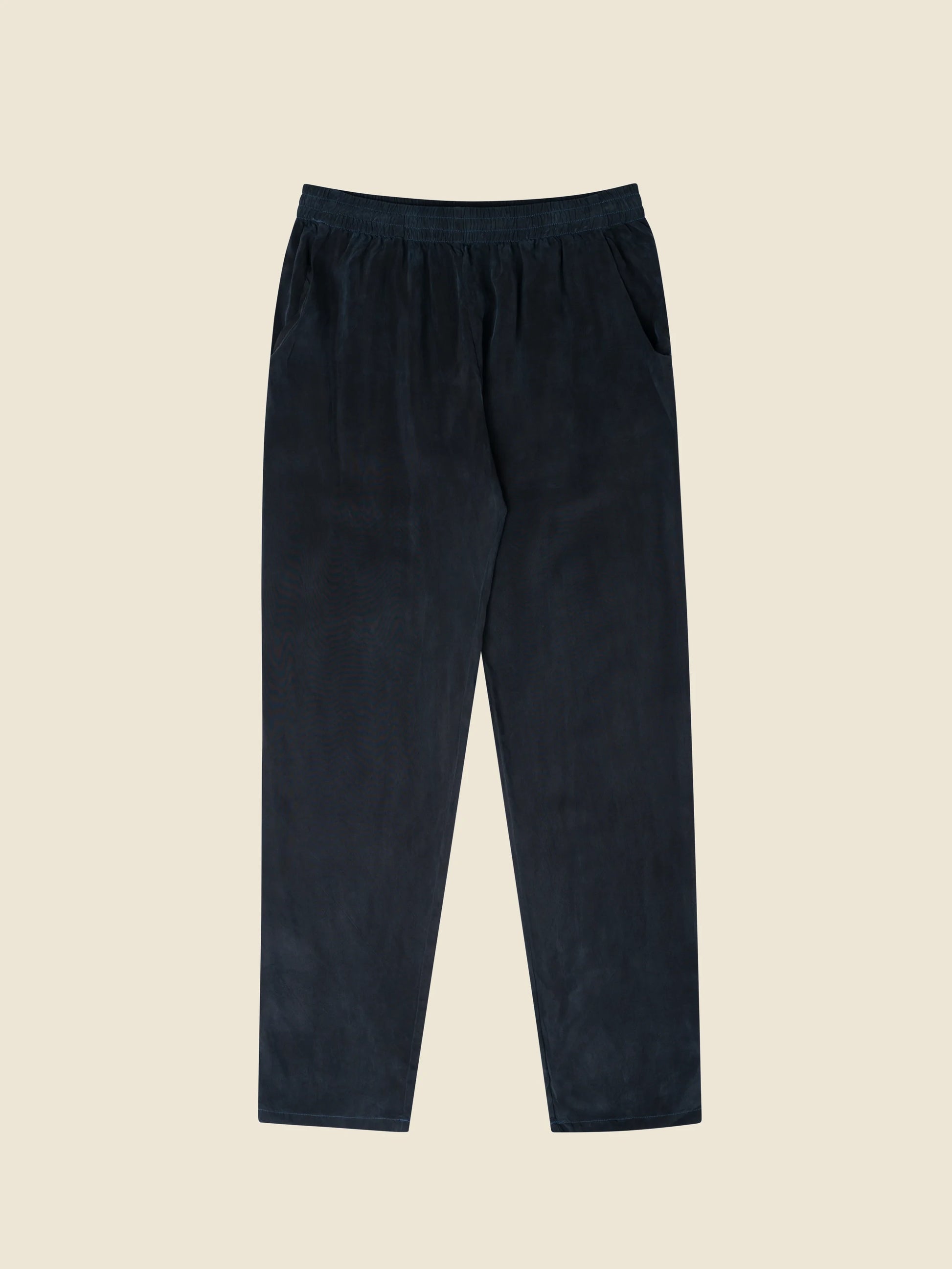 The Iggy pant is a classic pant with a slightly tapered fit, renowned for its exceptionally soft hand and feel. It is made from custom Japanese Cupro, which is 100% recycled cotton, and features a unique Peach Skin Sueded Finish that provides a silky texture, excellent drape, and breathability. The Iggy pant includes an elastic waistband, spacious cotton-lined side pockets, and a tonal internal drawcord, combining comfort and functionality with a refined and luxurious aesthetic.
