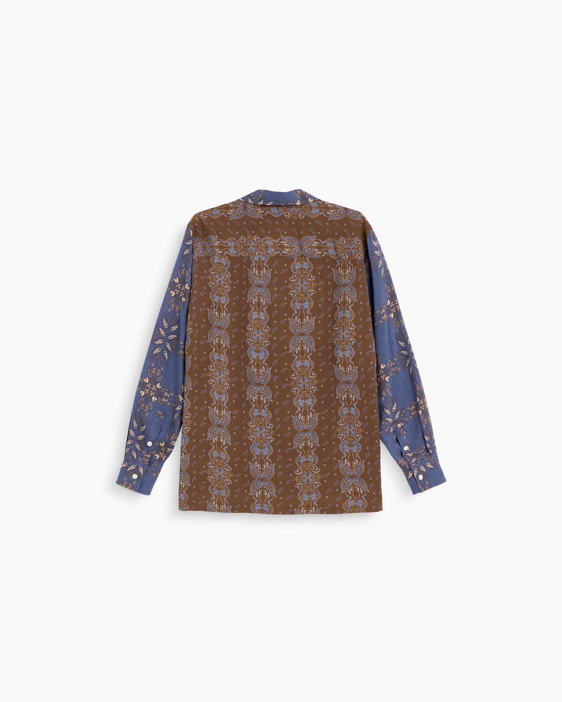 Long-sleeve viscose shirt with blue and brown split paisley pattern. Lightweight fabric with soft drape and relaxed fit. Designed with a resort collar and button closure.