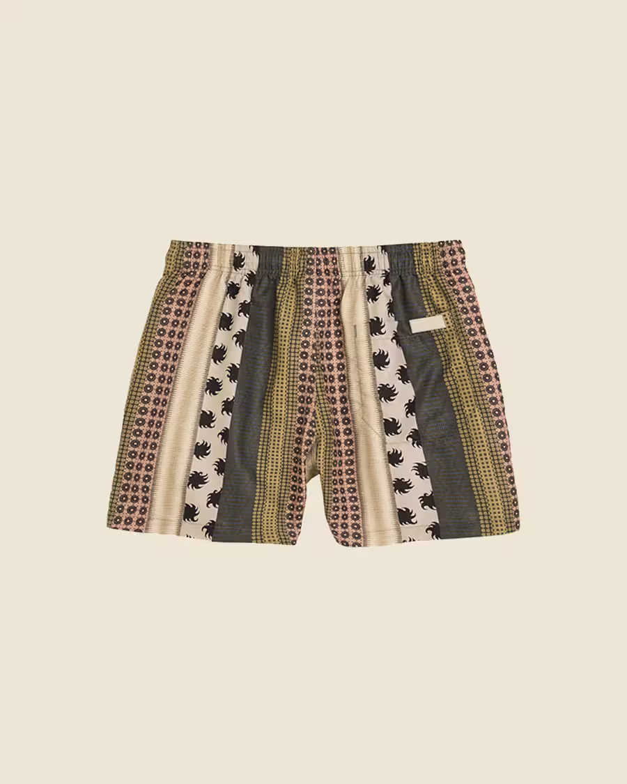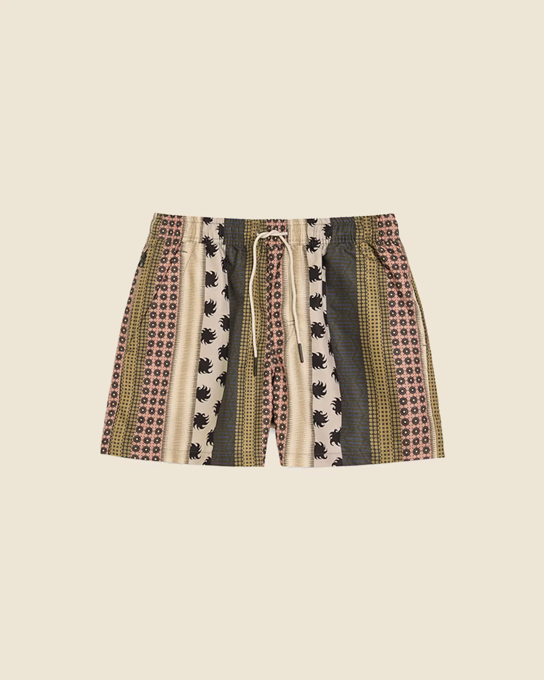 Patterned swim shorts in lightweight quick-drying fabric with vertical stripes of mixed prints. Elastic waist with four pockets including a hidden zip pocket. Mesh lining for comfort. Tailored fit and mid-rise.