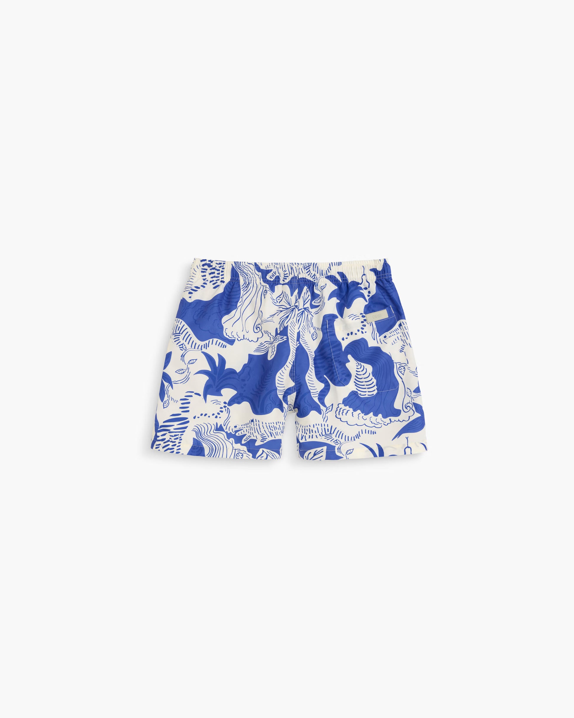 Blue swim shorts with an ocean-inspired pattern. Lightweight and quick-drying. Mesh lining and pockets. Tailored fit with mid-rise and elastic waist.