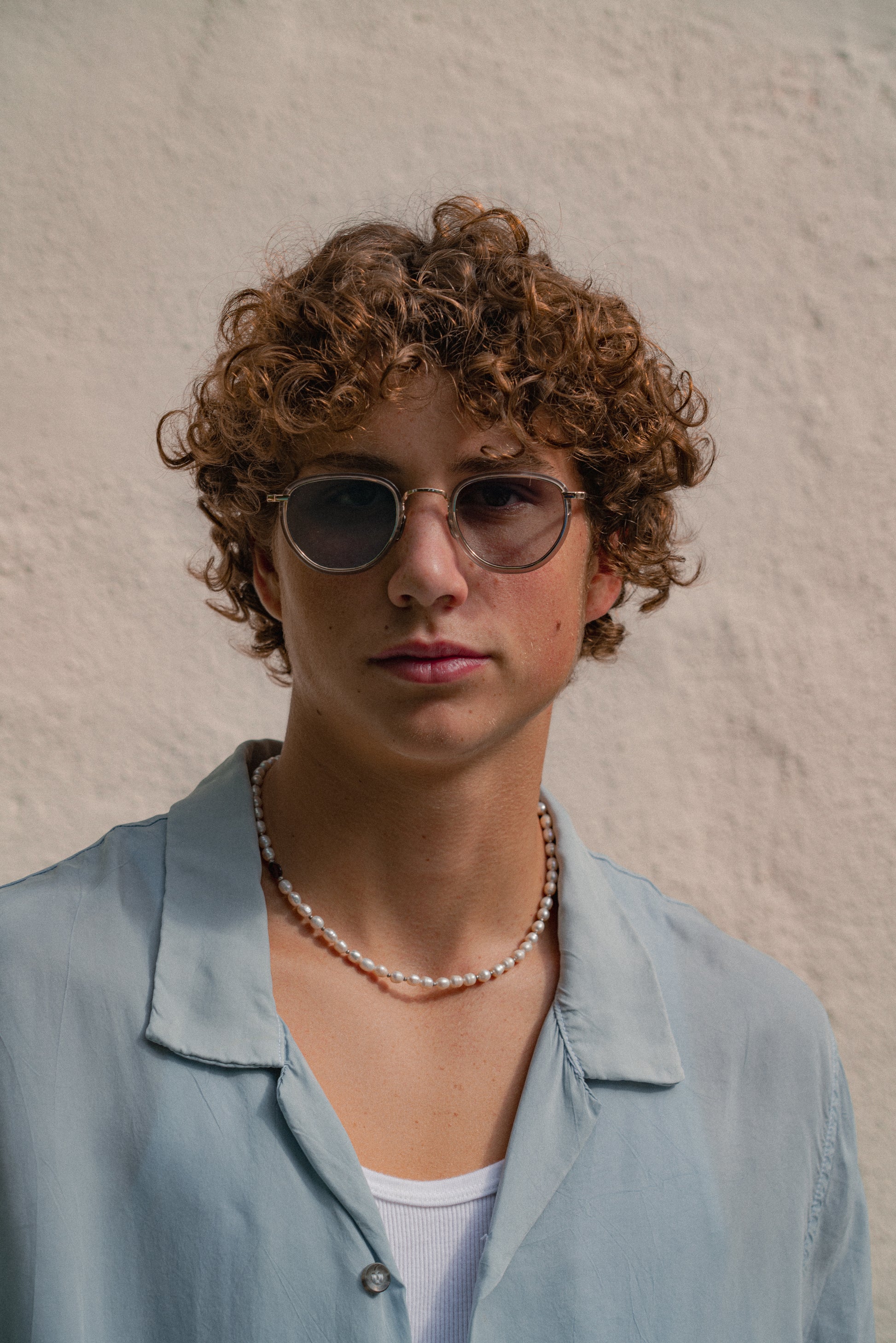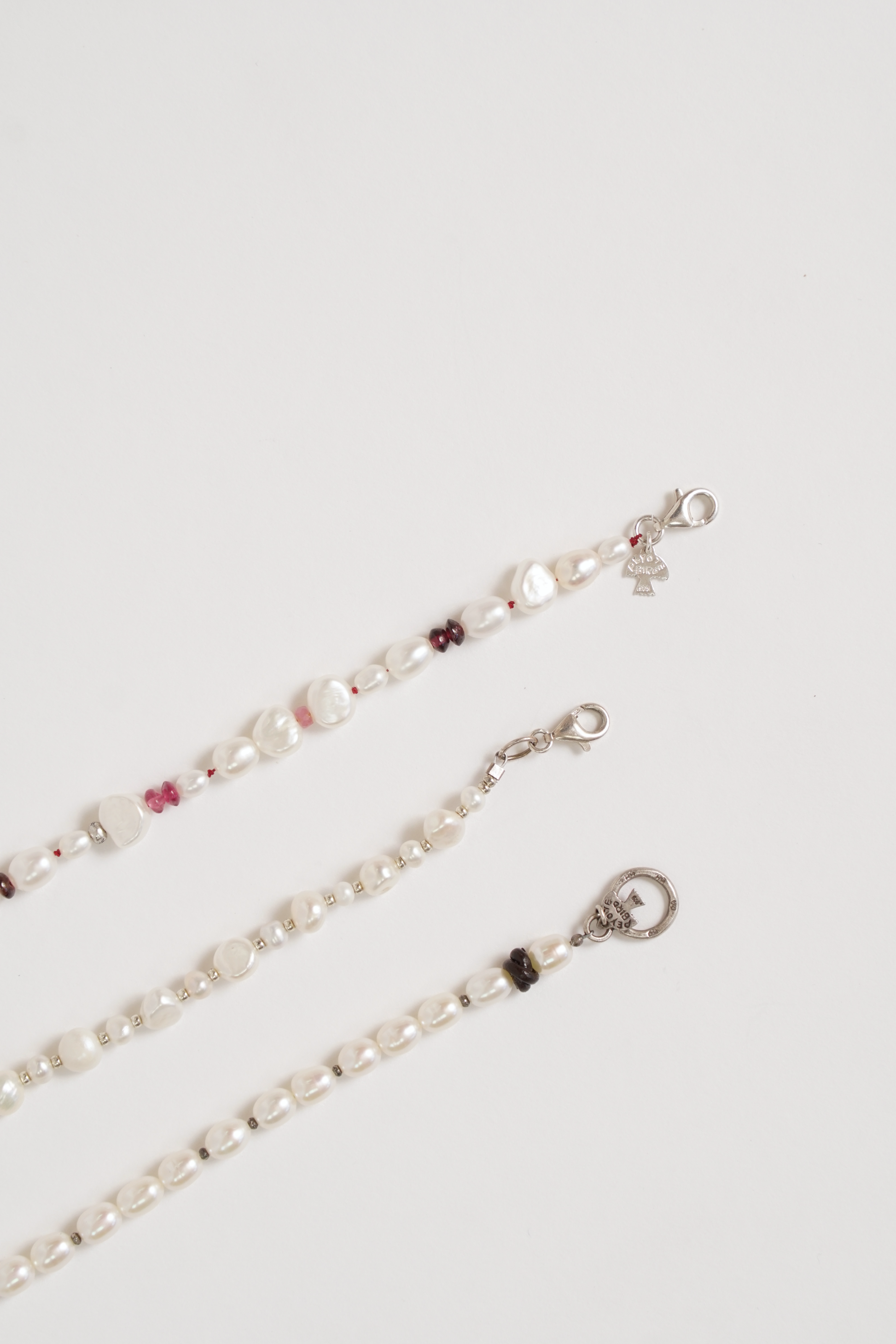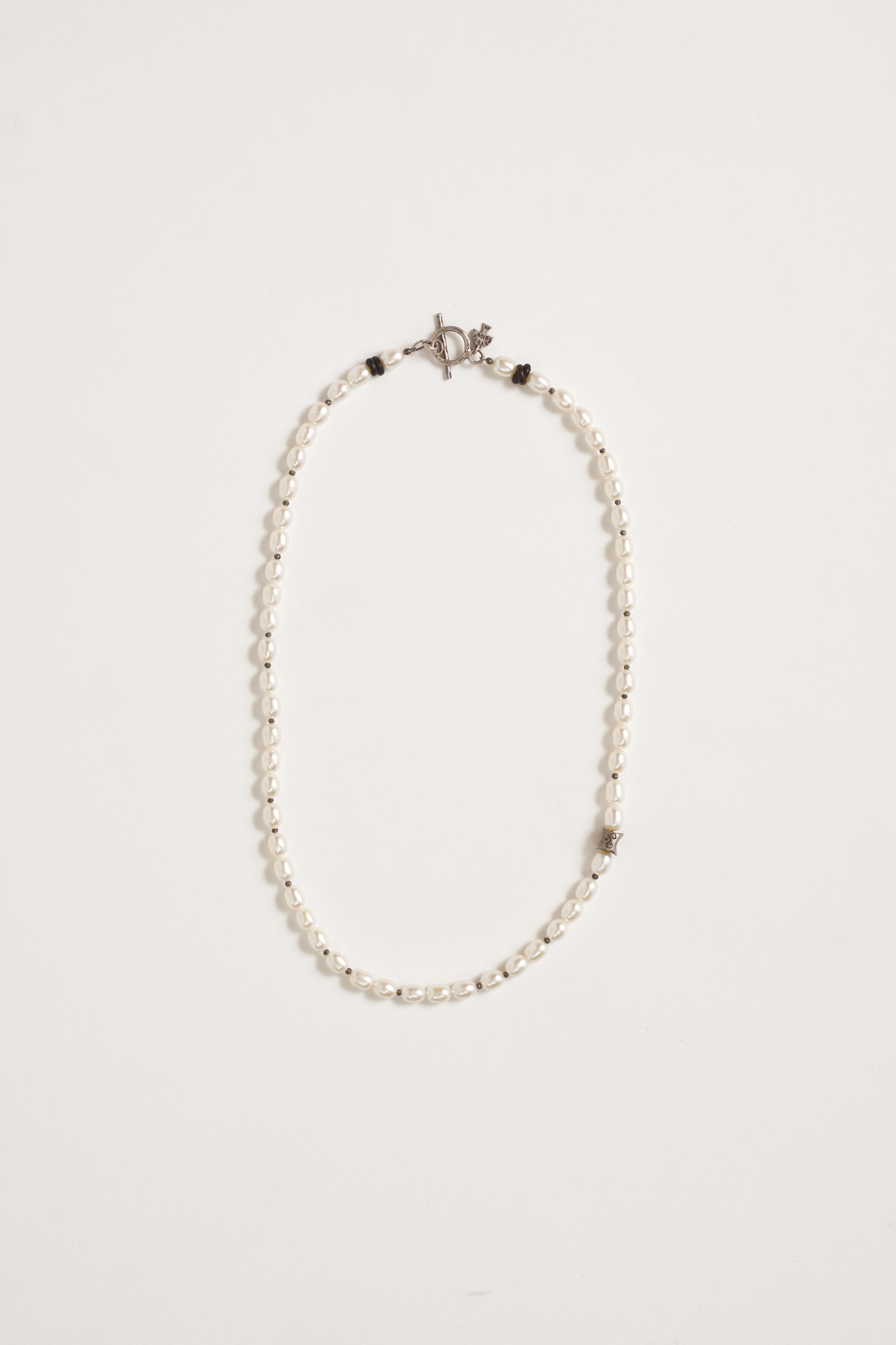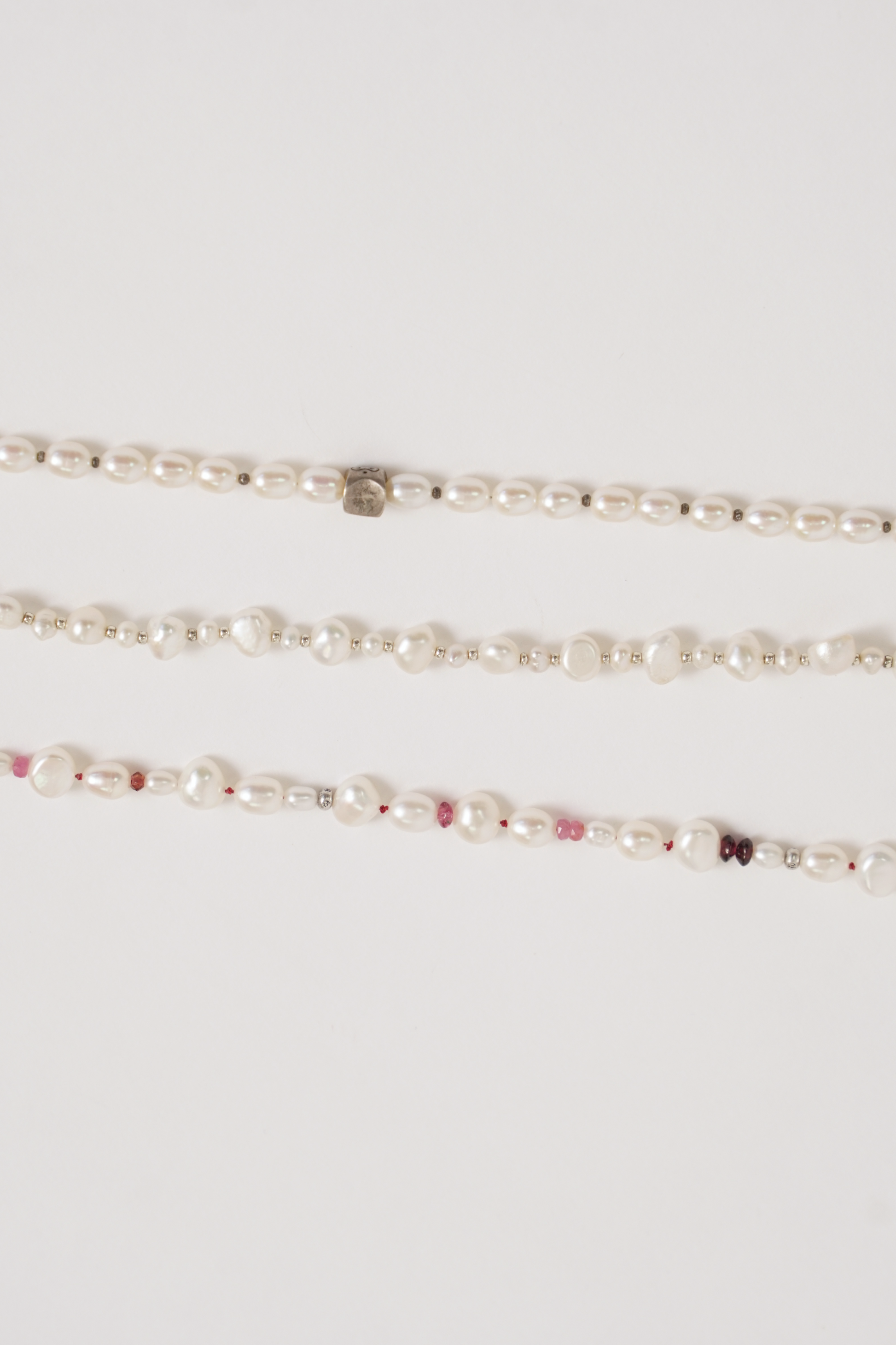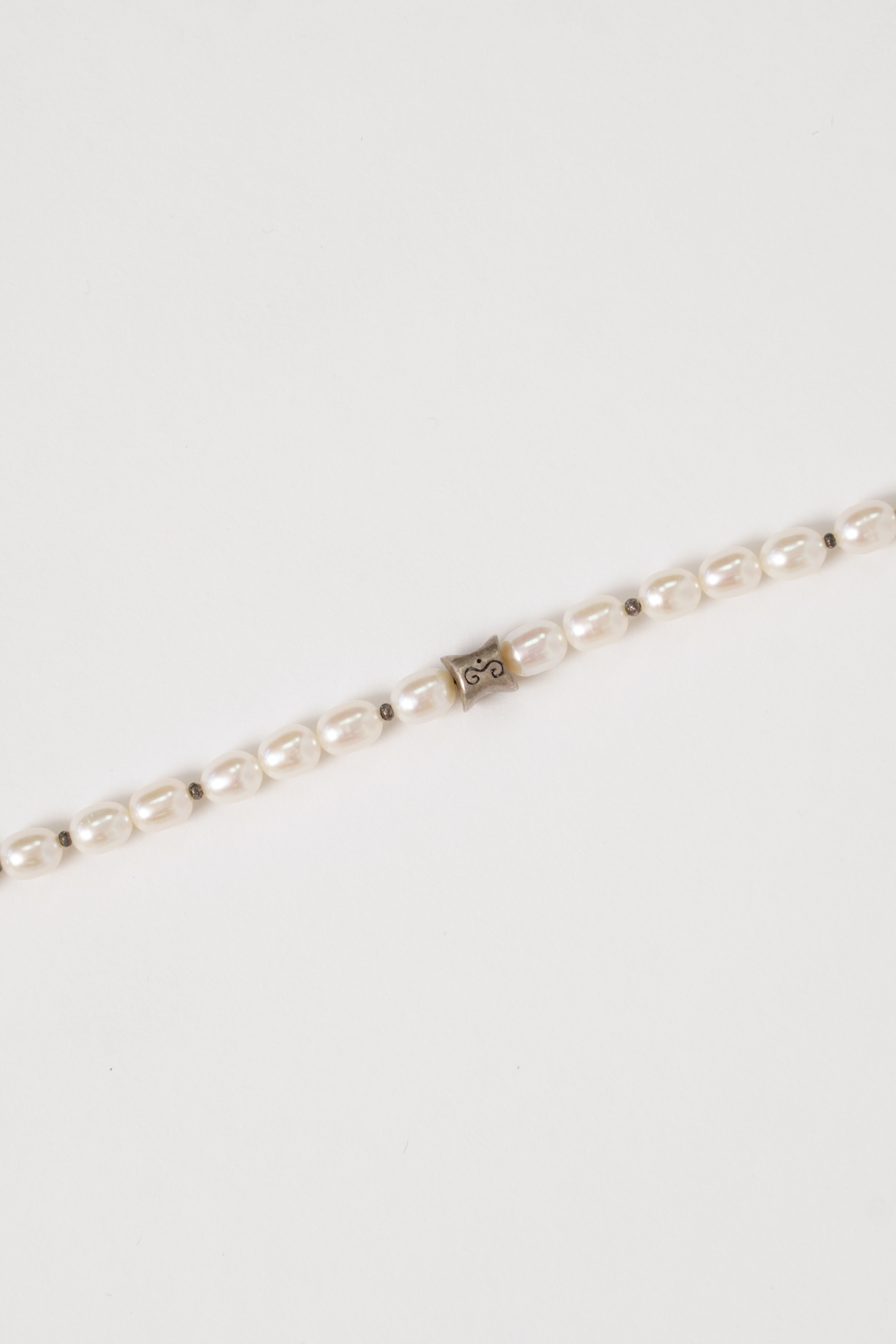 18" pearl necklace. Fresh water pearls, leather, + sterling silver clasp. Hand-made in Sante Fe, New Mexico.
