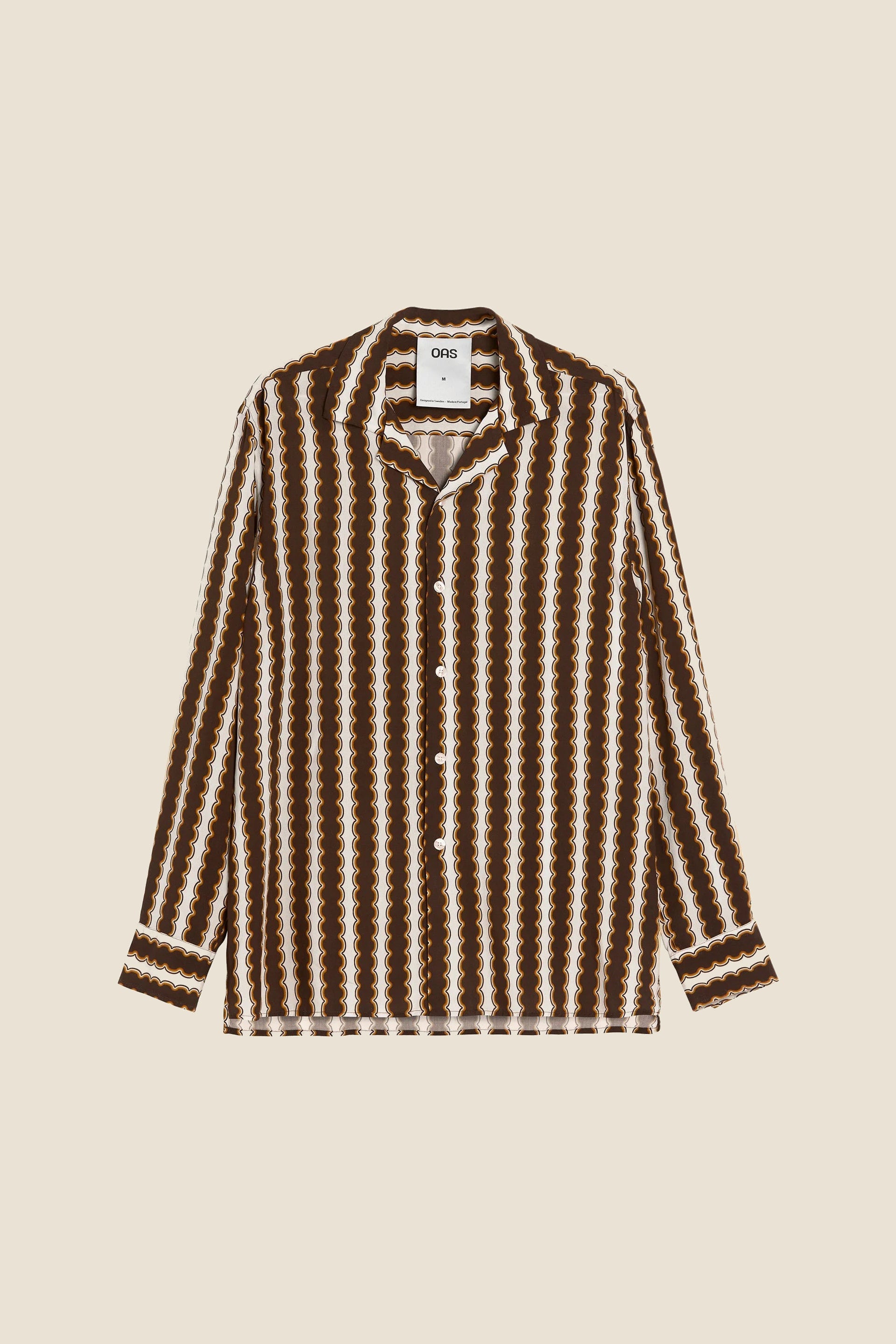 The Rapallo Viscose long sleeve is tailored to a relaxed silhouette in an airy viscose fabric with a silky soft feel, featuring a scalloped stripe pattern oozing with '70s spirit. It has a resort collar and buttons throughout the front.