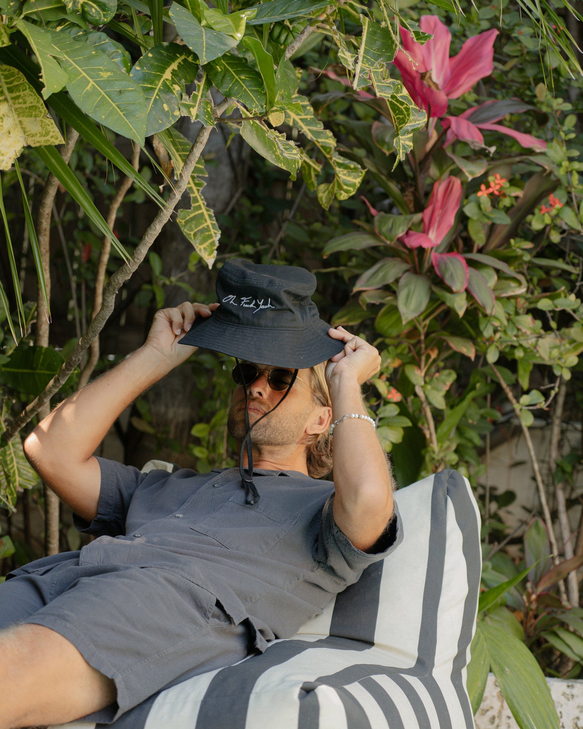 The Signature Wide Brim bucket features a mid-weight 100% cotton canvas. This hat includes a self-fabric chin strap with a recycled plastic adjustable toggle. One size fits all.