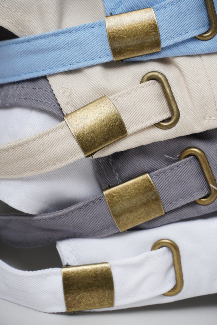 Six panel, unstructured curved bill hat. Self-fabric back strap with adjustable oxidized brass buckle closure. One size fits most.