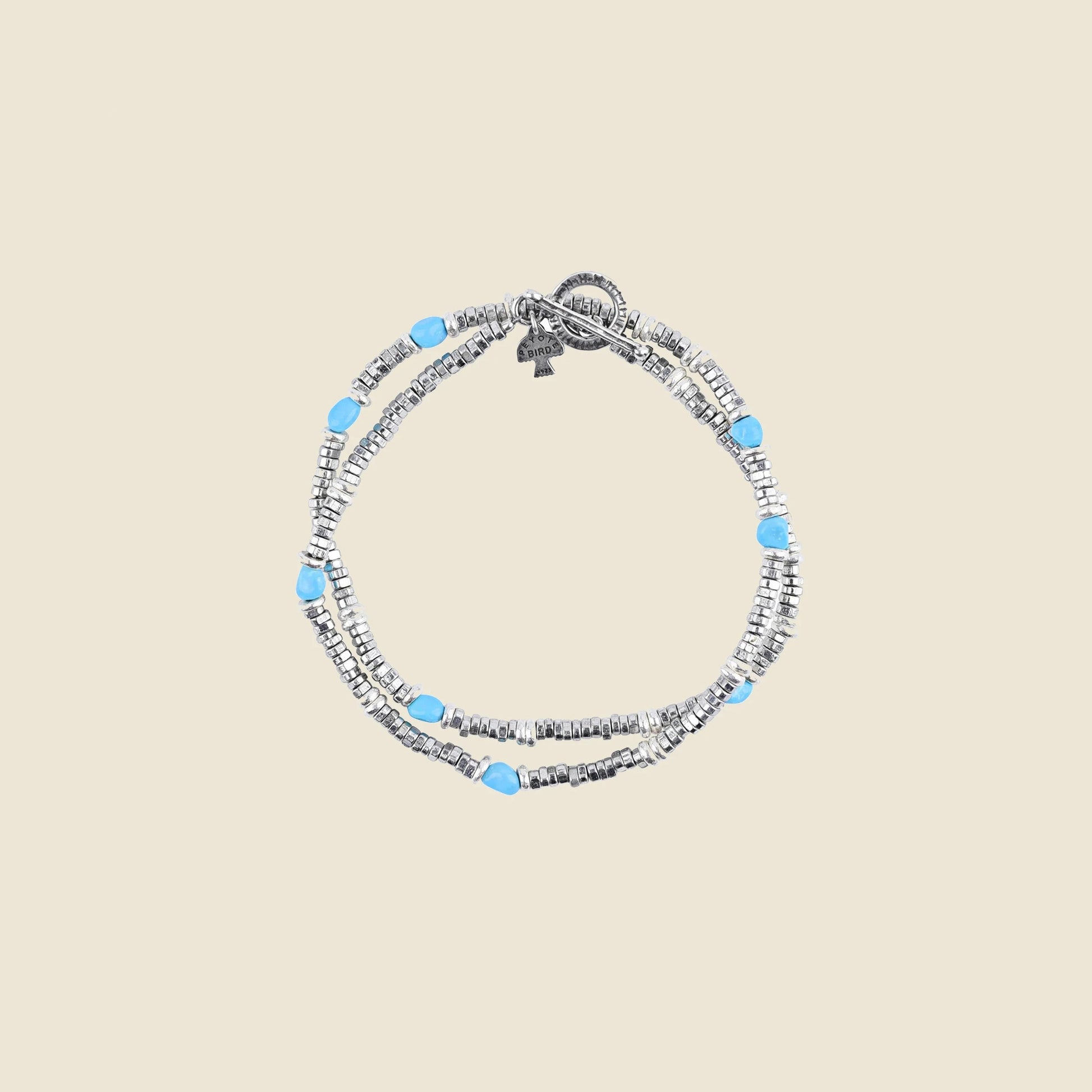 The Stelio Wrap Bracelet is expertly handcrafted and adorned with pops of turquoise. Elevate any outfit with this beautifully designed wrap bracelet, perfect for adding a touch of sophistication and style.