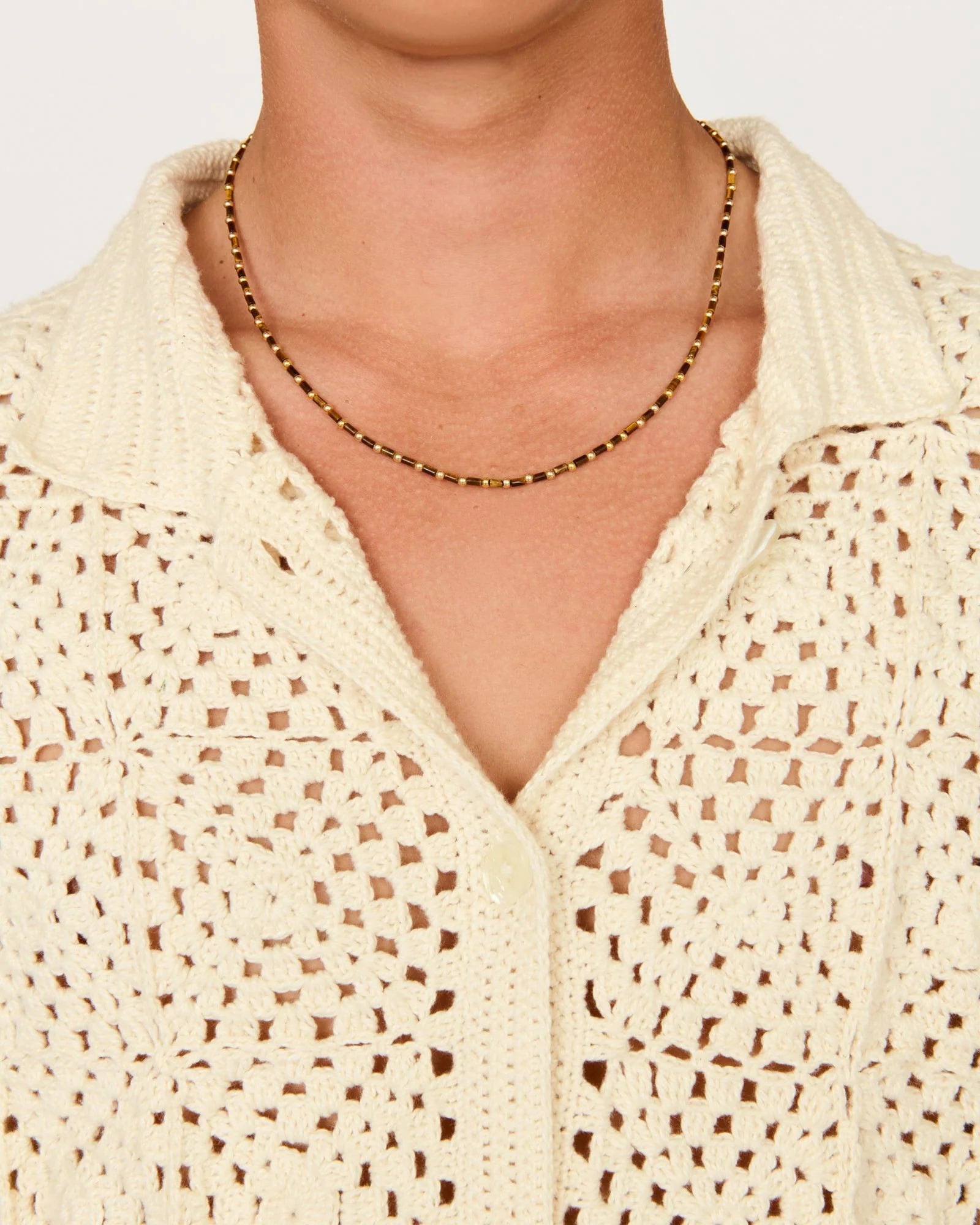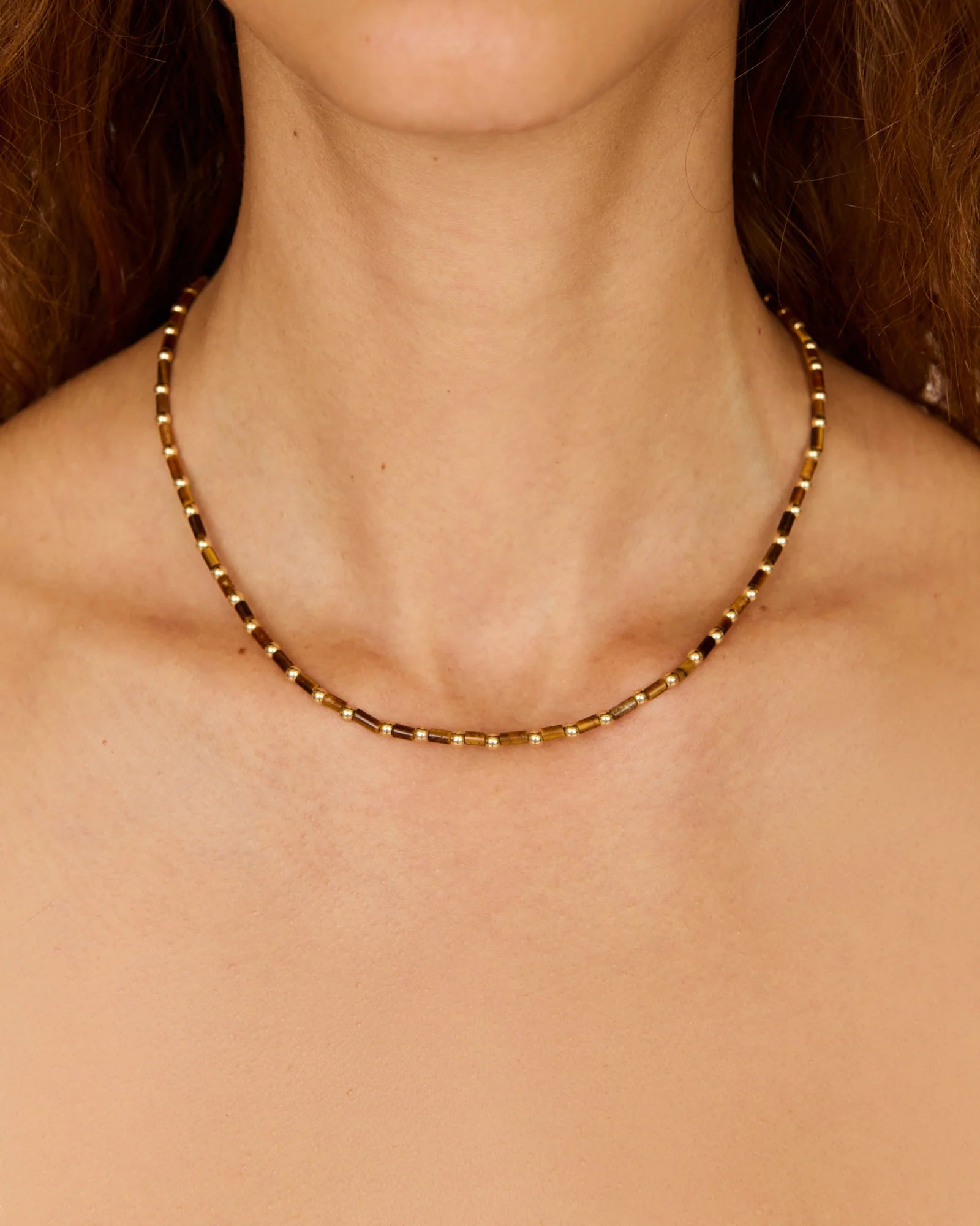 The perfect layering piece all year long; our Tayo Necklace is designed to be worn daily. A classic éliou design, this necklace is composed of natural Tiger Eye and gold filled beads